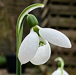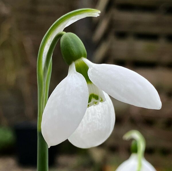 ERITI KAUNIS sinihallide lehtede ja valgete õitega vähelevinud hilisem lumikellukesesort aeda. Välimised õielehed ümarad, sisemised kahe rohelise märgiga.